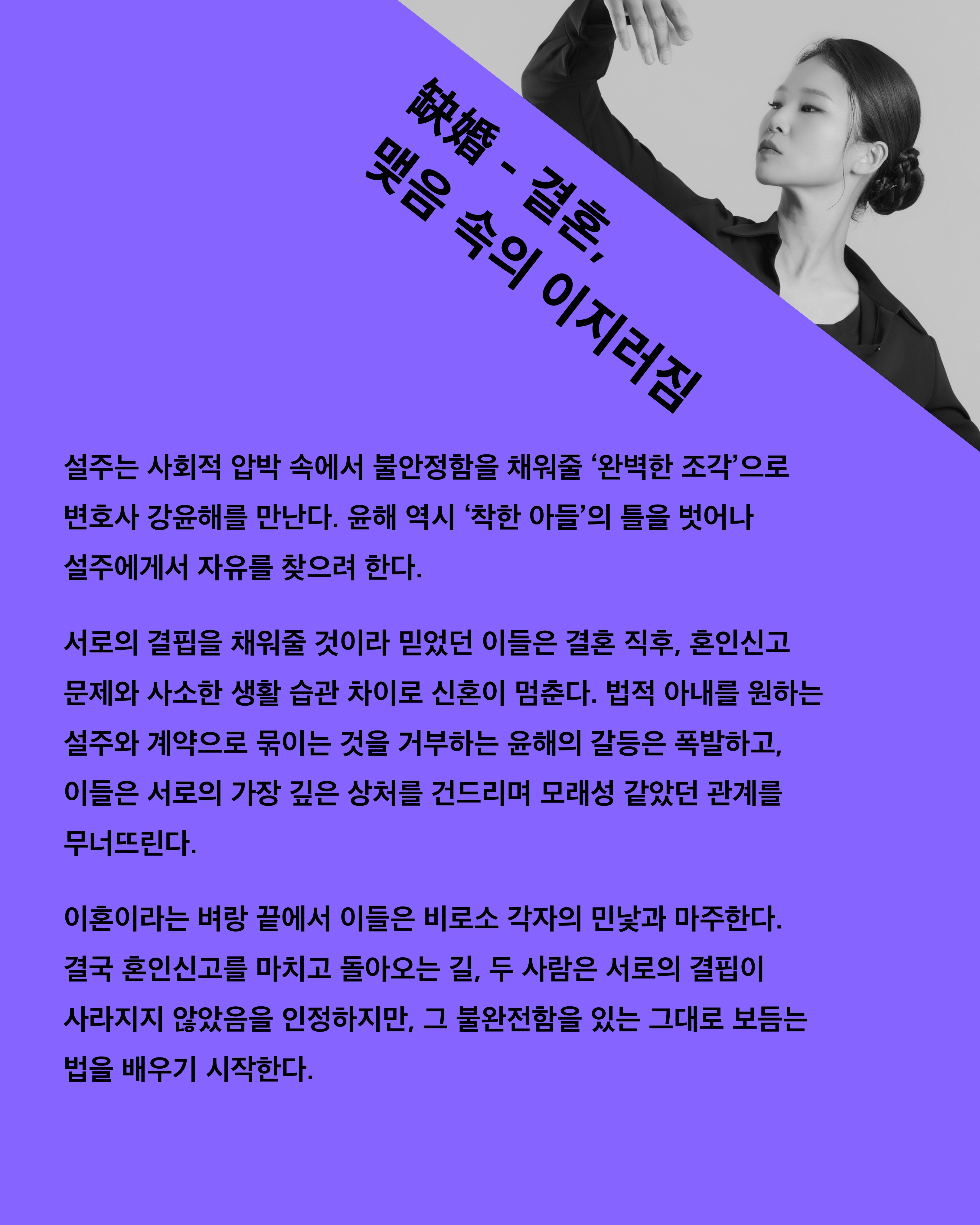 설주는 사회적 압박 속에서 불안정함을 채워줄 ‘완벽한 조각’으로 변호사 강윤해를 만난다. 윤해 역시 ‘착한 아들’의 틀을 벗어나 설주에게서 자유를 찾으려 한다.