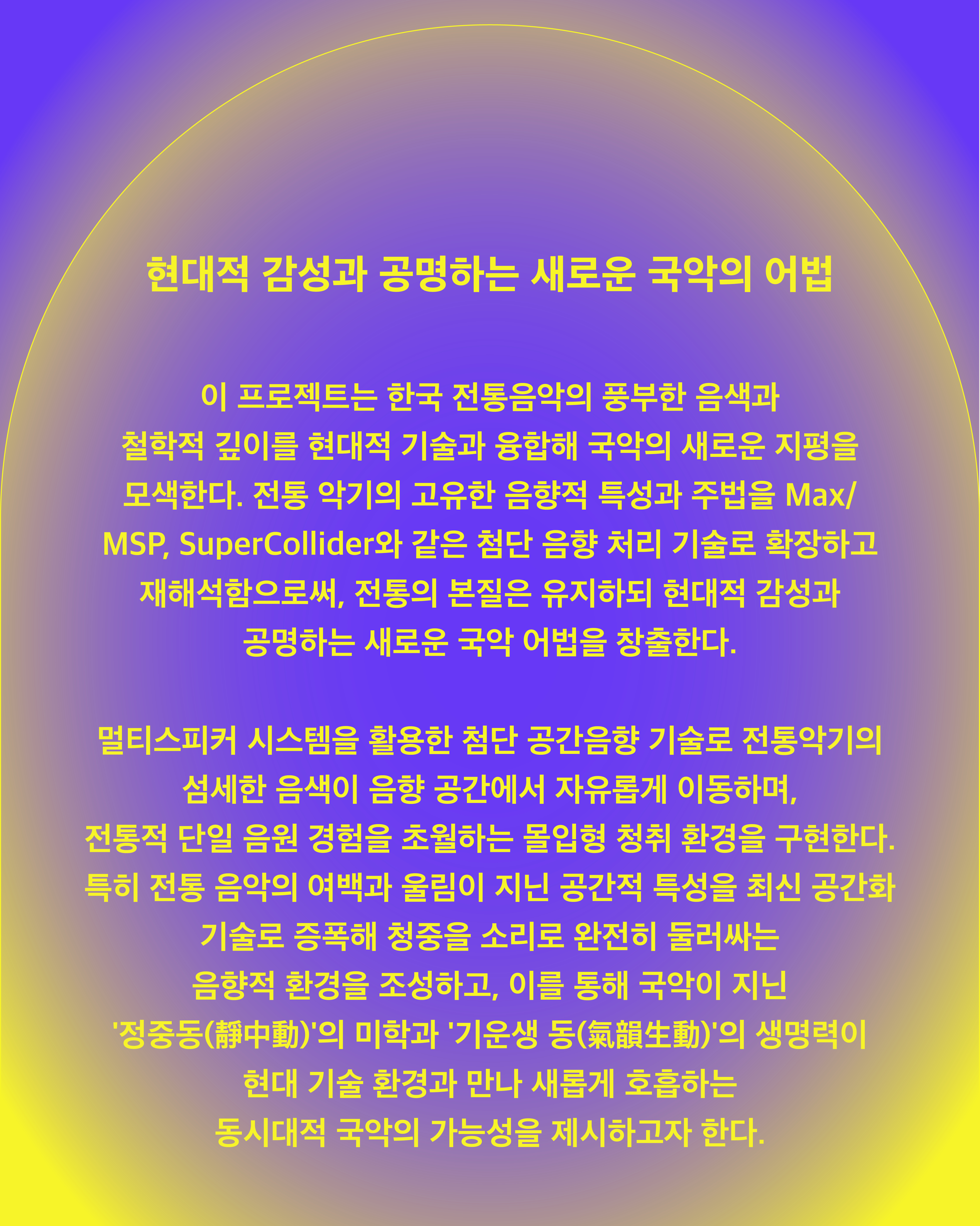이 프로젝트는 한국 전통음악의 풍부한 음색과 철학적 깊이를 현대적 기술과 융합해 국악의 새로운 지평을 모색한다. 전통 악기의 고유한 음향적 특성과 주법을 Max/MSP, SuperCollider와 같은 첨단 음향 처리 기술로 확장하고 재해석함으로써, 전통의 본질은 유지하되 현대적 감성과 공명하는 새로운 국악 어법을 창출한다.