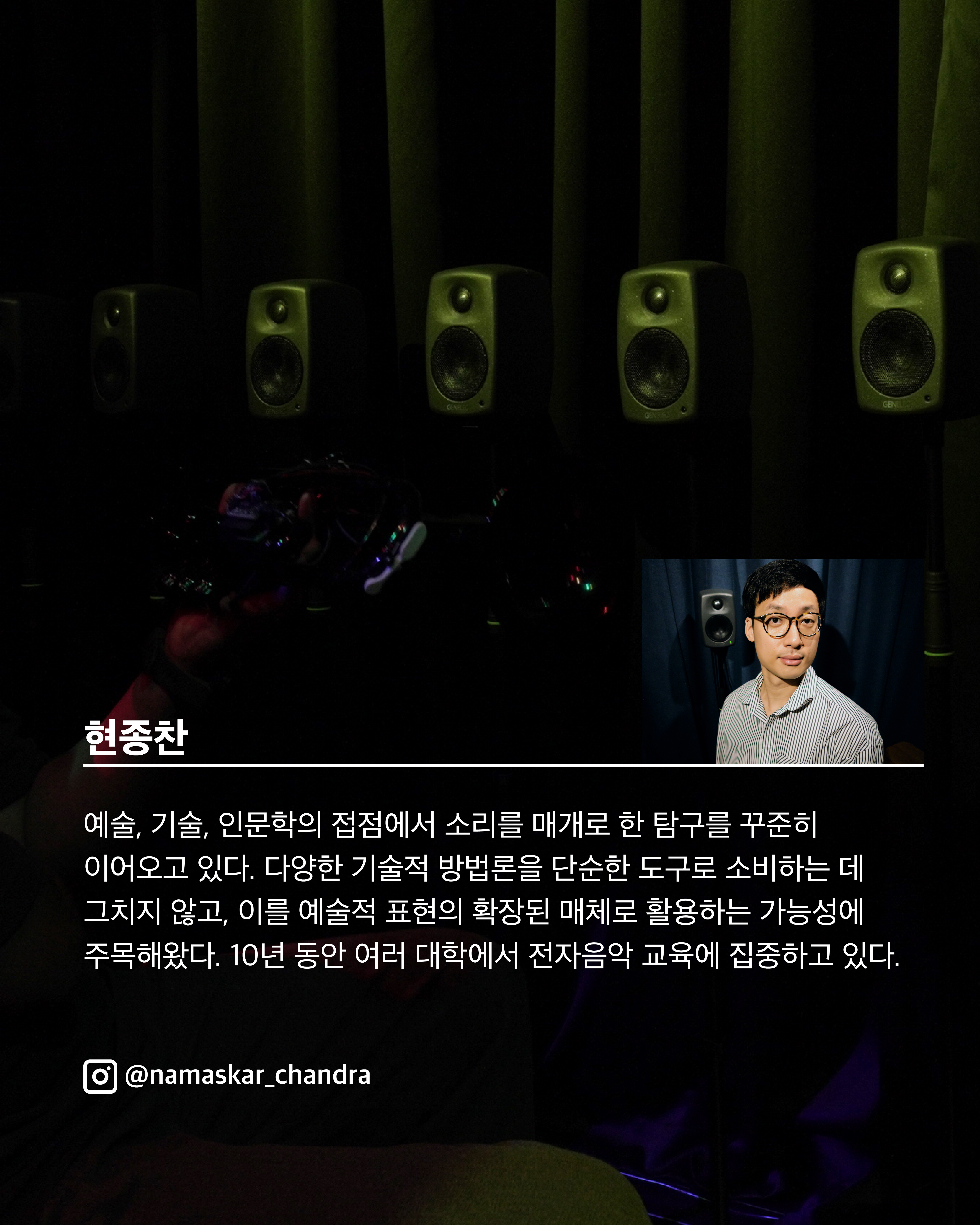 음악을 통해 인간 존재와 세계에 대한 본질적인 질문을 던지며, 이를 깊이 있게 탐구해온 작곡가이자 사운드 아티스트다. 인간 존재의 미학적, 사회적, 정치적 맥락을, 소리를 통해 조명하고, 전통 악기와 전자음악, 퍼포먼스를 넘나들며 사운드 설치와 공연 예술의 영역까지 작업을 확장해왔다.