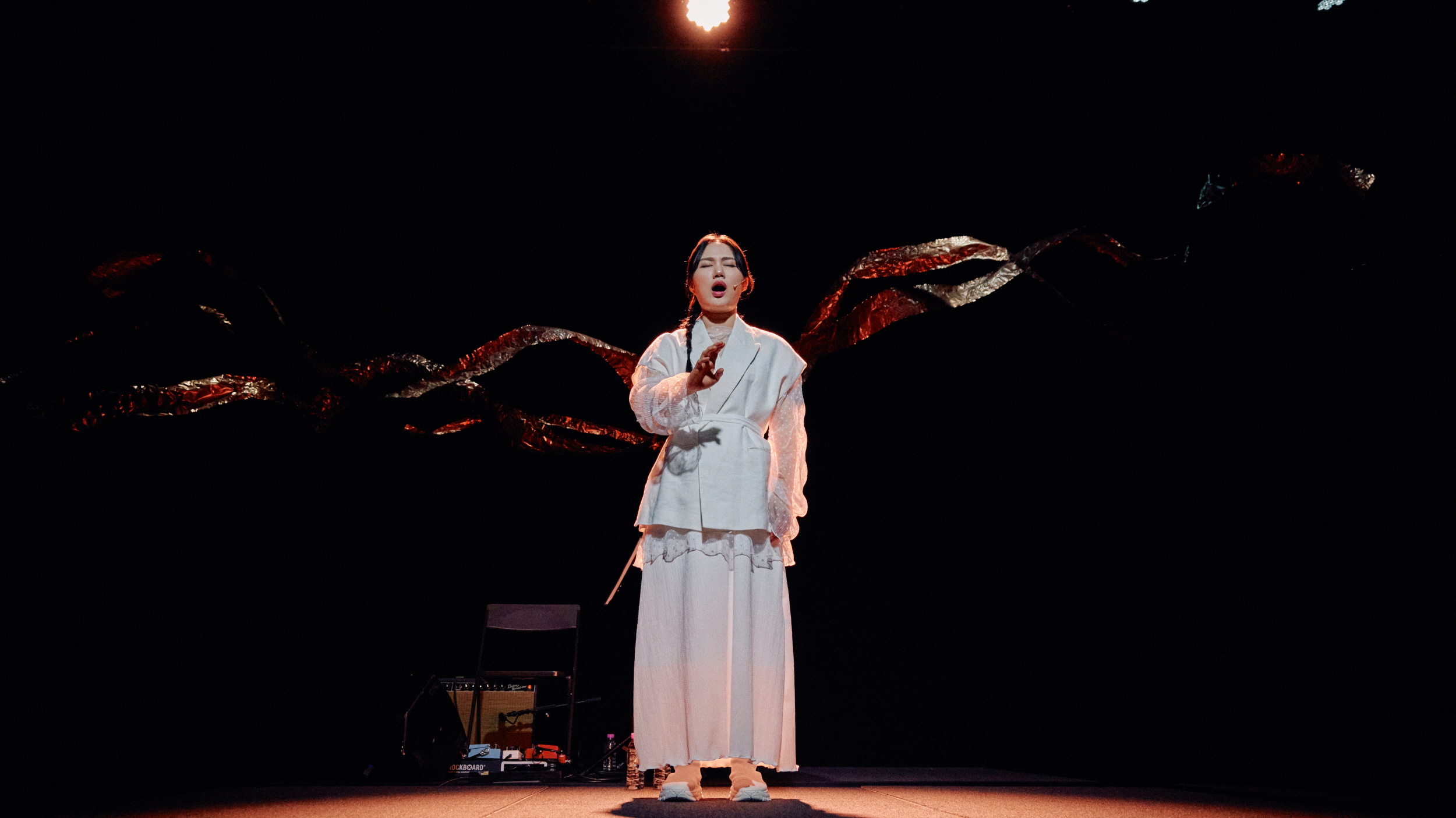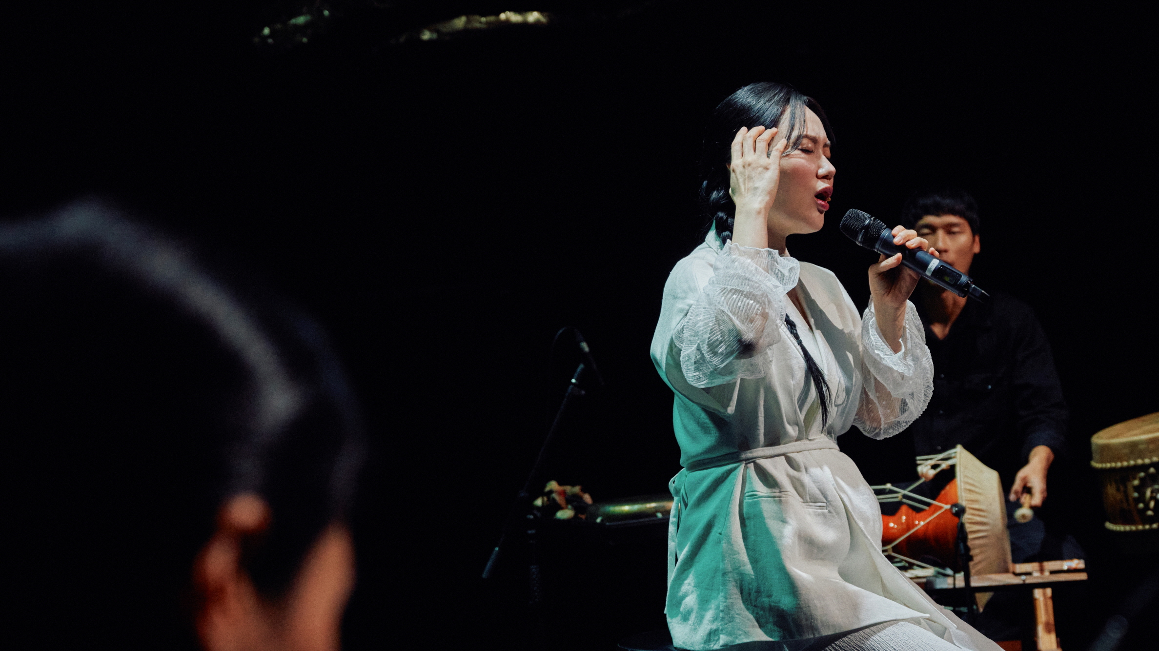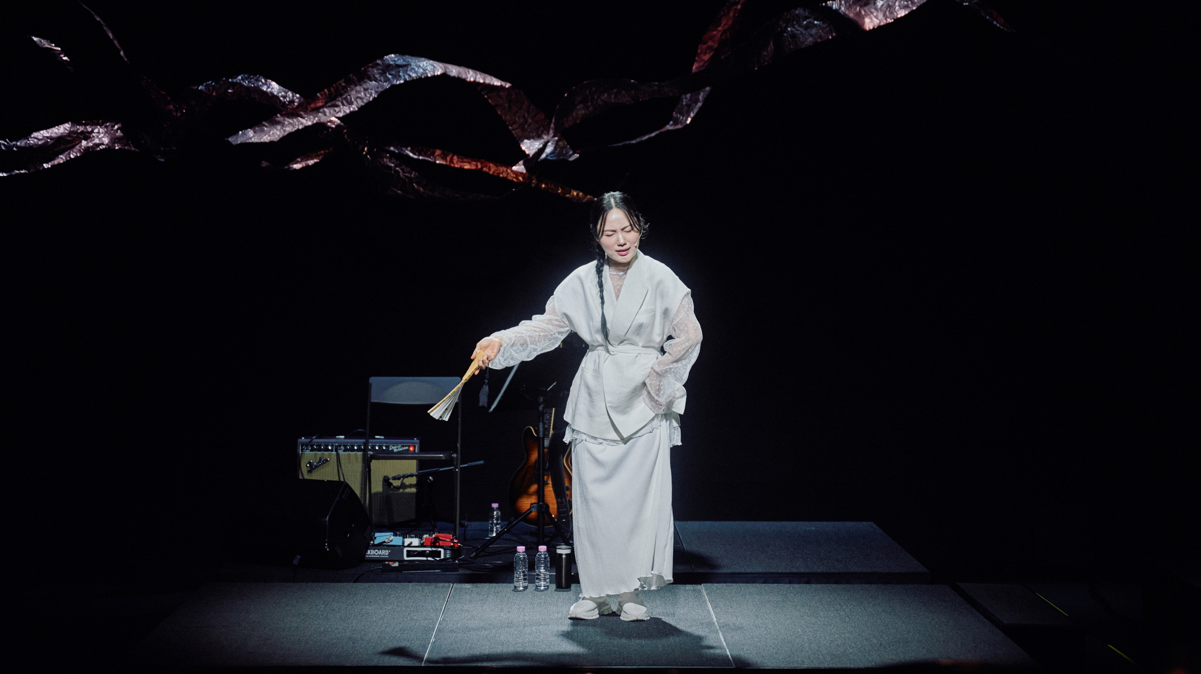 앞선 무대가 이나래의 기반과 역량을 확인하는 장면이었다면, 이후 이어진 무대는 ‘창작자 이나래’가 무엇을 말하고 싶은지, 어떤 음악적 언어로 자신을 구성하려 하는지 보여주는 영역이었다. 이 지점에서 공연은 단순한 레퍼토리의 나열을 넘어, 그의 음악적 방향과 정체성을 가늠하게 했다. 이나래가 직접 가사를 쓰고, 작·편곡과 프로듀싱에 참여한 앨범 <지금 어디>는 그의 개인적인 이야기를 바탕으로 하며, 대부분의 곡은 verse와 chorus, bridge로 이루어진 대중음악 형식으로 되어있었다. 총 6곡 중 <물에 들라>만 전통 판소리의 한 부분을 가져왔고, 나머지는 소리 창법을 활용해 부르는 창작곡이었다.