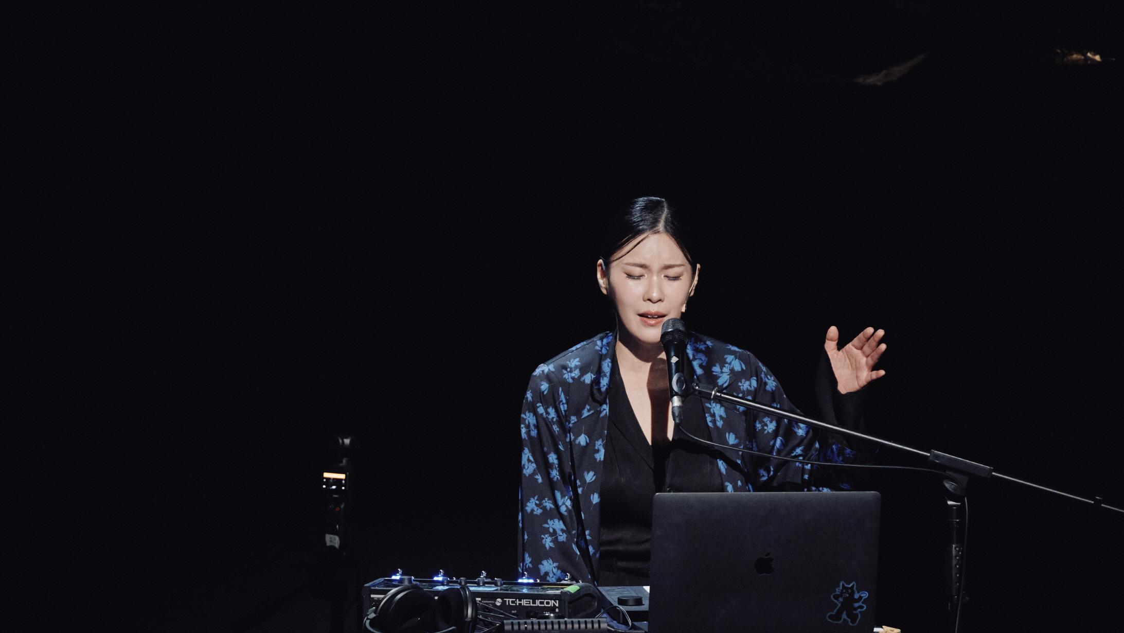 음악을 나열하기보다 공연을 하나의 일관된 서사로 엮어내는 감각, 음악의 뉘앙스에 따라 가창의 방식을 유연하게 변화시키는 태도는 분명 권송희의 덕목이다. 곡마다 다른 결을 취하고, 장면마다 온도를 달리하면서 하나의 공연으로 이끌어 가는 숙련된 힘도 돋보인다. 그러나 전자음악이라는 재료의 ‘유’와 ‘무’를 두루 고려해 보면, 공연 속 음악은 권송희의 고유한 색채를 특정할 수 있는 단서가 되기보다 그 정체를 포착하기 어려운 방향으로 기운다. 상투적인 화성적 접근에서 벗어나 음향적 분위기를 설계하는 방식으로 전자음악을 사용하는 제스처는 분명히 감지되지만 그 변화들 속에서 무엇이 지속되고 있는지는 끝내 명확하게 드러나지 않는다.