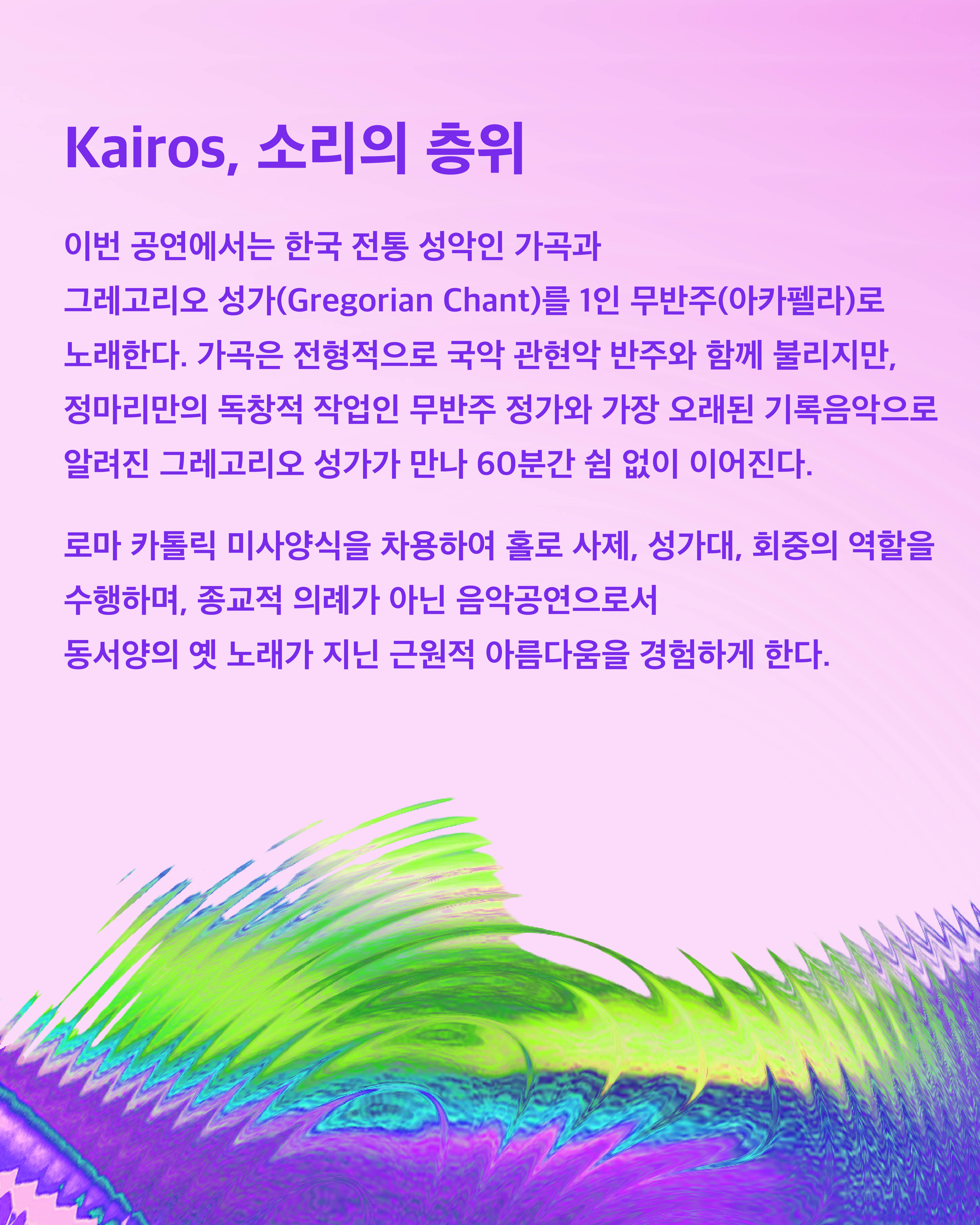 이번 공연에서는 한국 전통 성악인 가곡과 그레고리오 성가(Gregorian Chant)를 1인 무반주(아카펠라)로 노래한다.