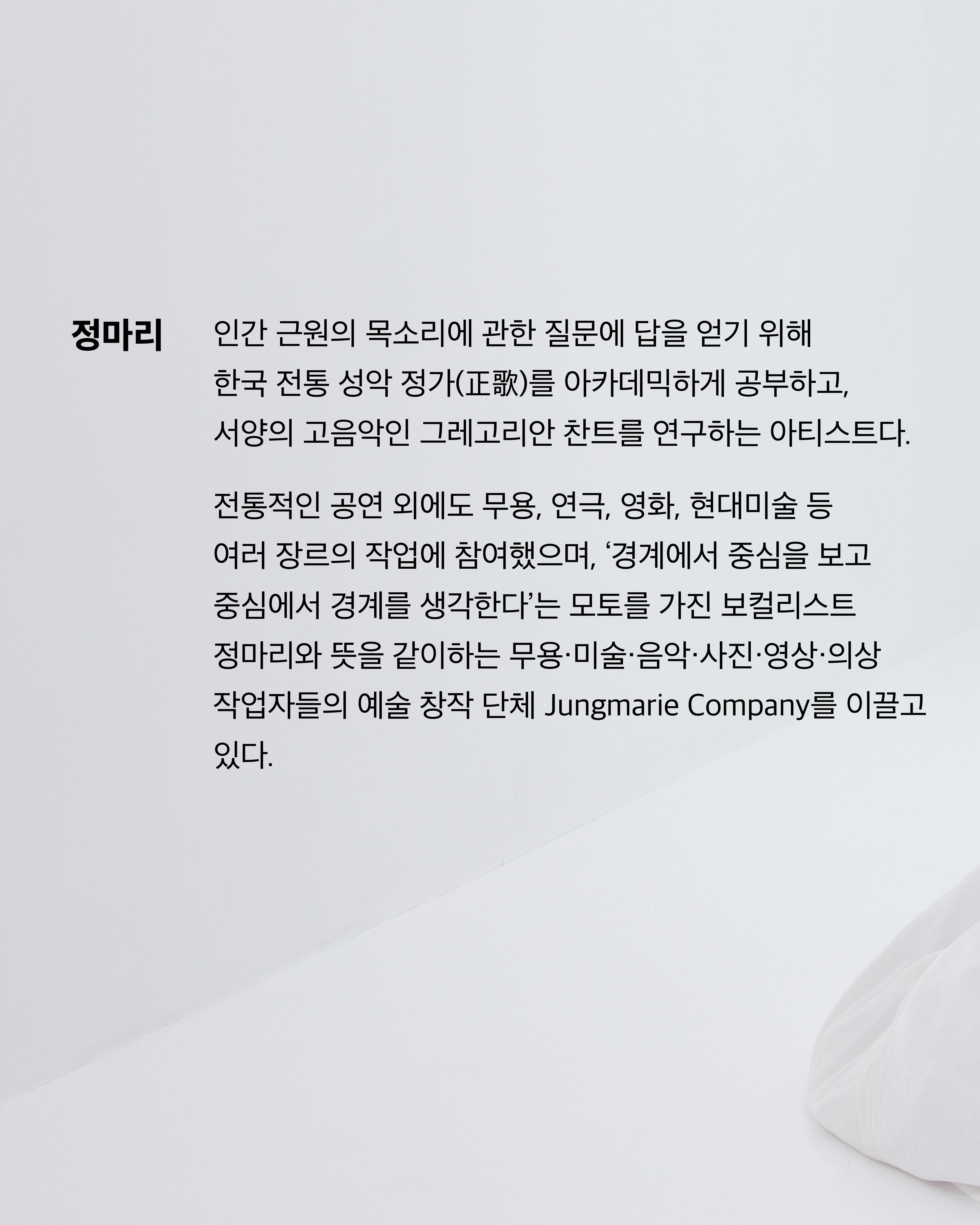 정마리는 인간 근원의 목소리에 관한 질문에 답을 찾기 위해 한국 전통 성악 정가(正歌)를 아카데믹하게 연구하고, 서양 고음악인 그레고리오 성가를 탐구하고 있는 아티스트다.