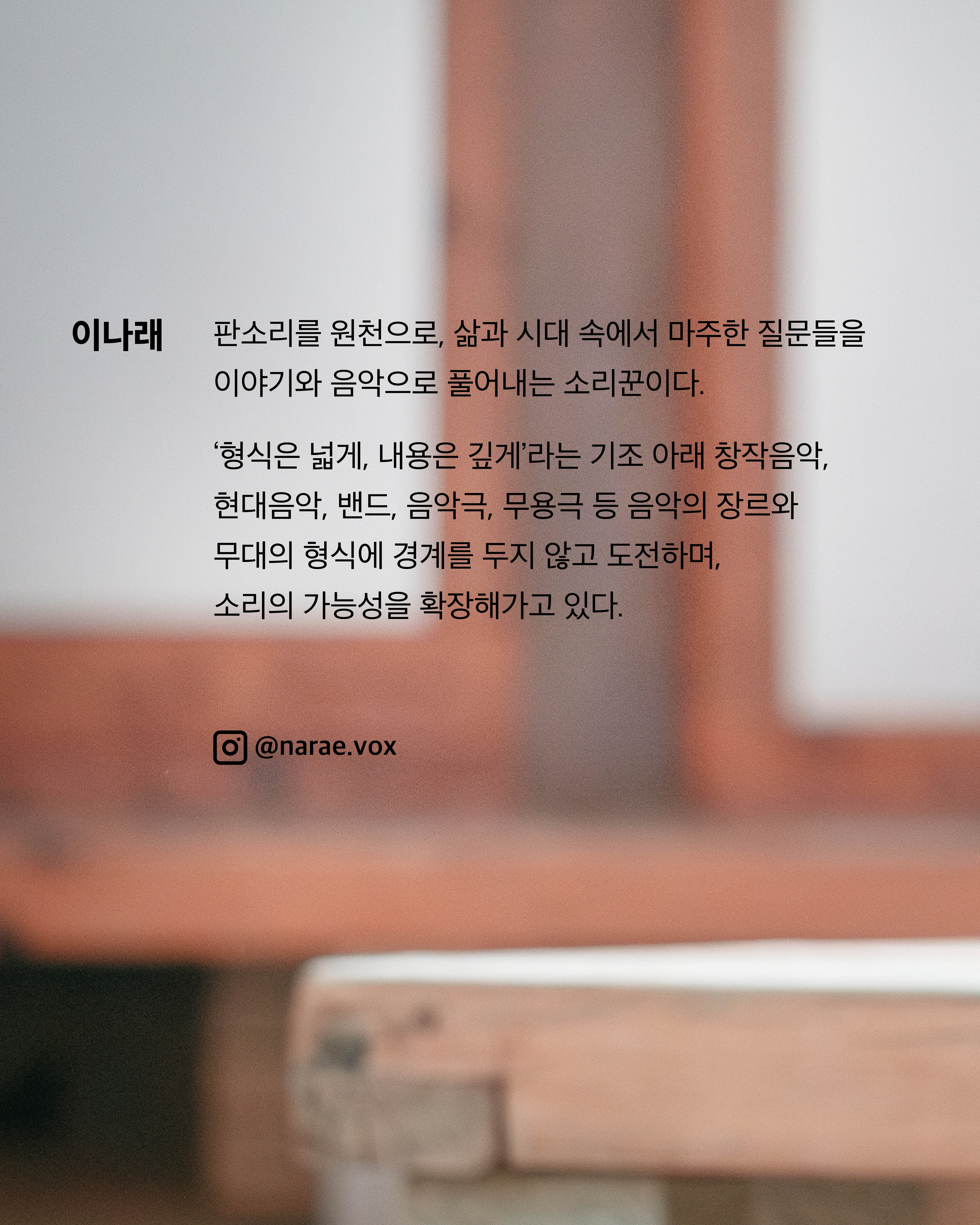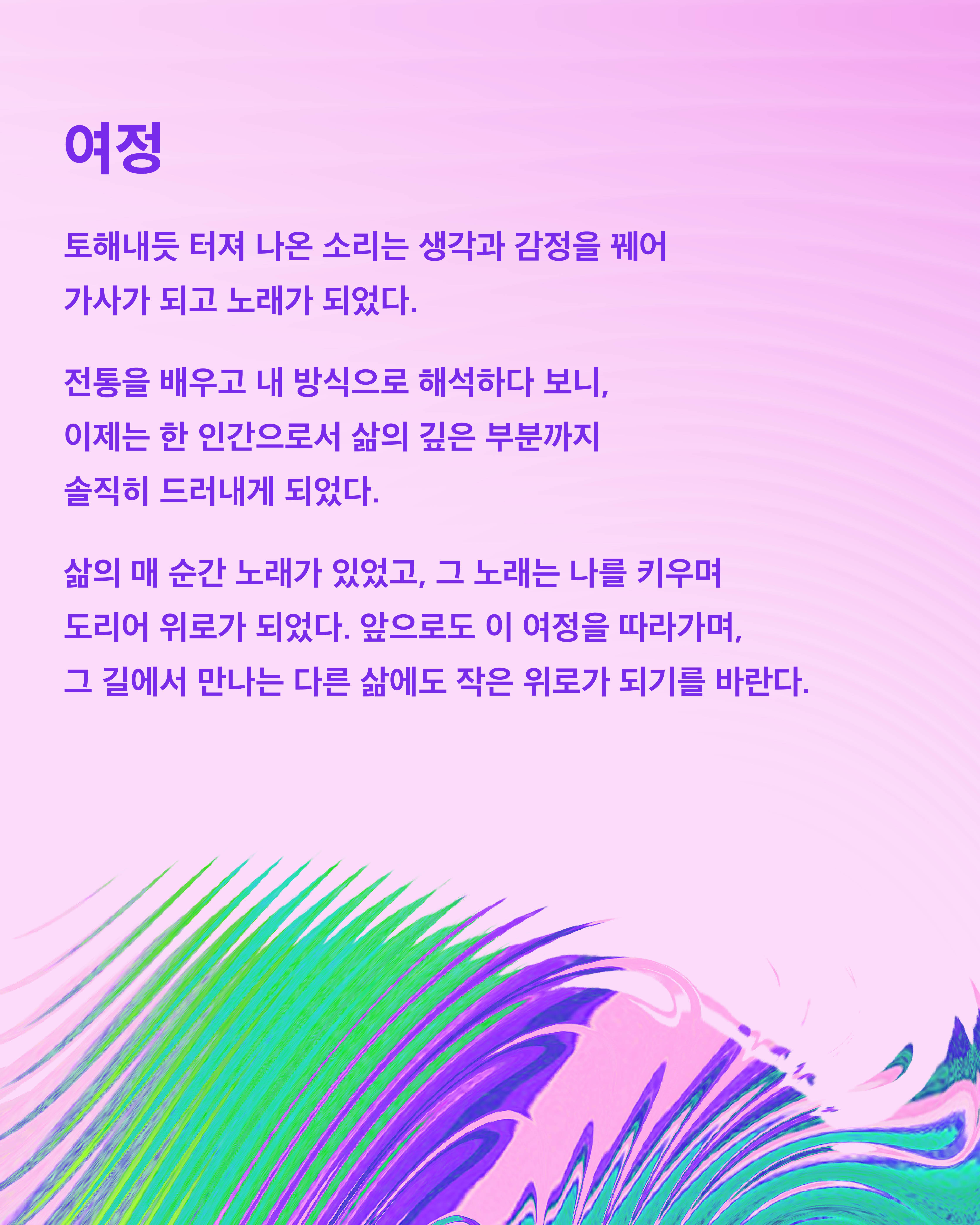 판소리를 원천으로, 삶과 시대 속에서 마주한 질문들을 이야기와 음악으로 풀어내는 소리꾼이다.