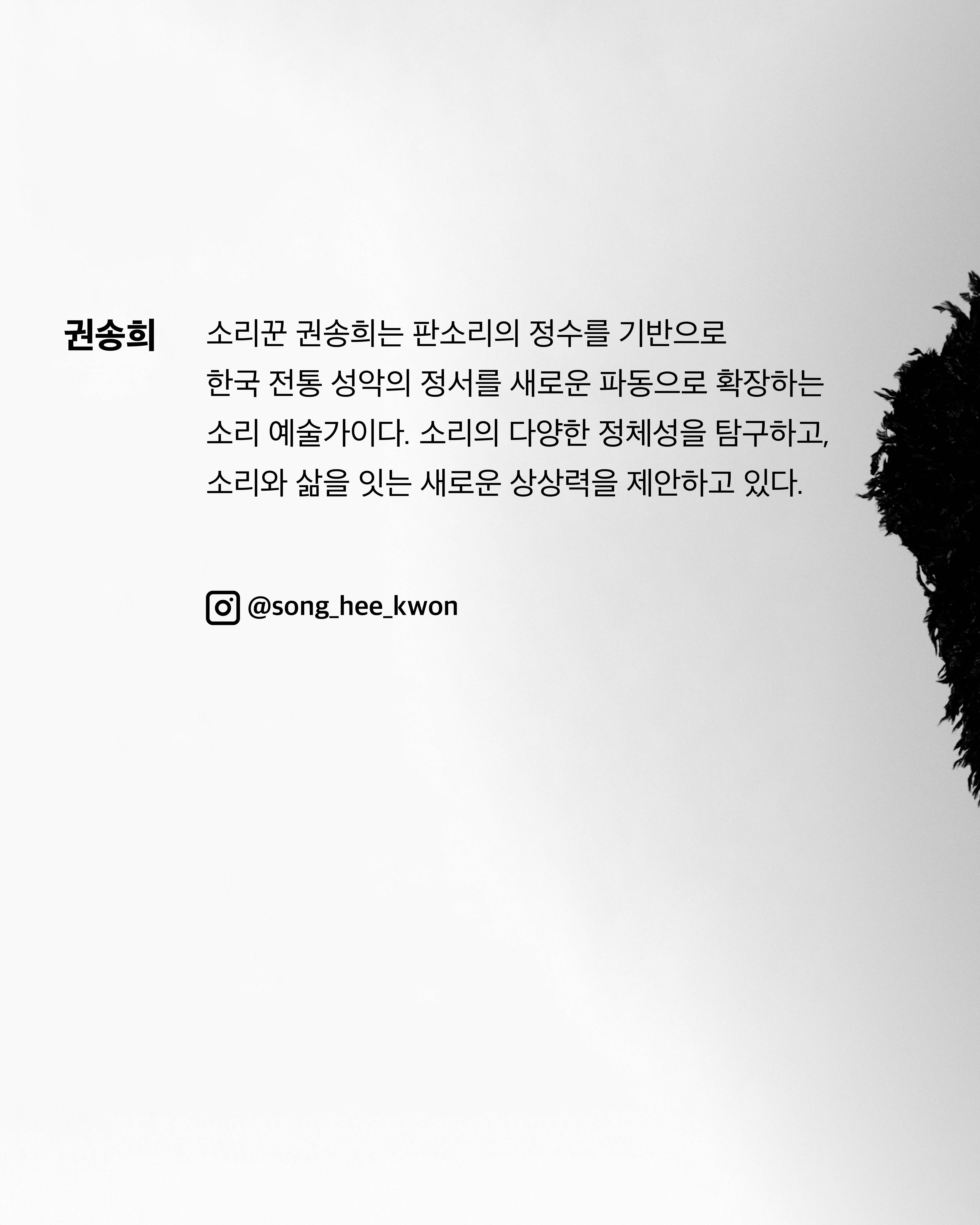 소리꾼 권송희는 판소리의 정수를 기반으로 한국 전통 성악의 정서를 새로운 파동으로 확장하는 소리 예술가이다.소리의 다양한 정체성을 탐구하고, 소리와 삶을 잇는 새로운 상상력을 제안하고 있다.