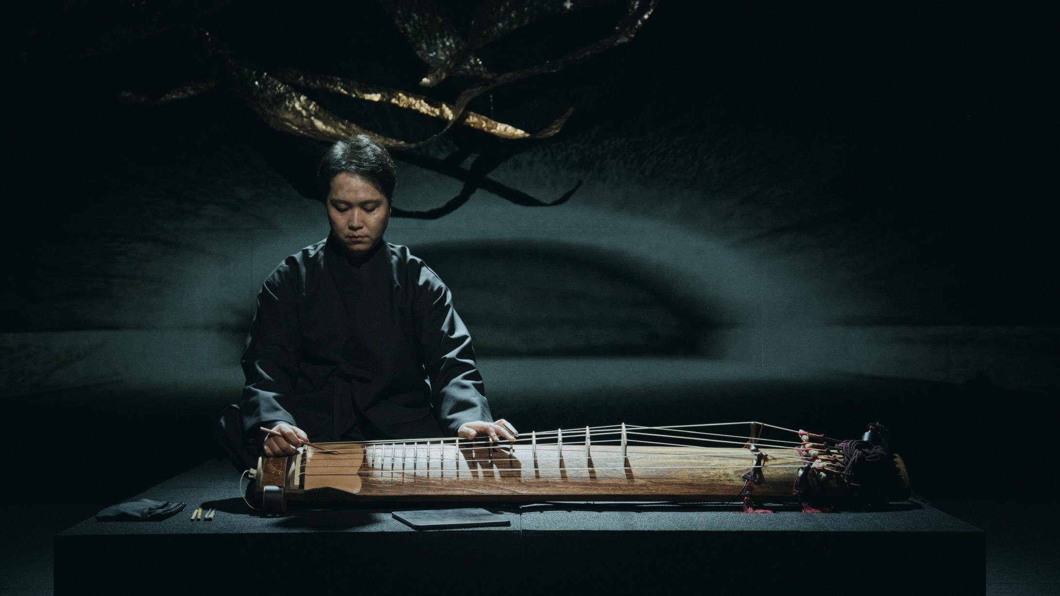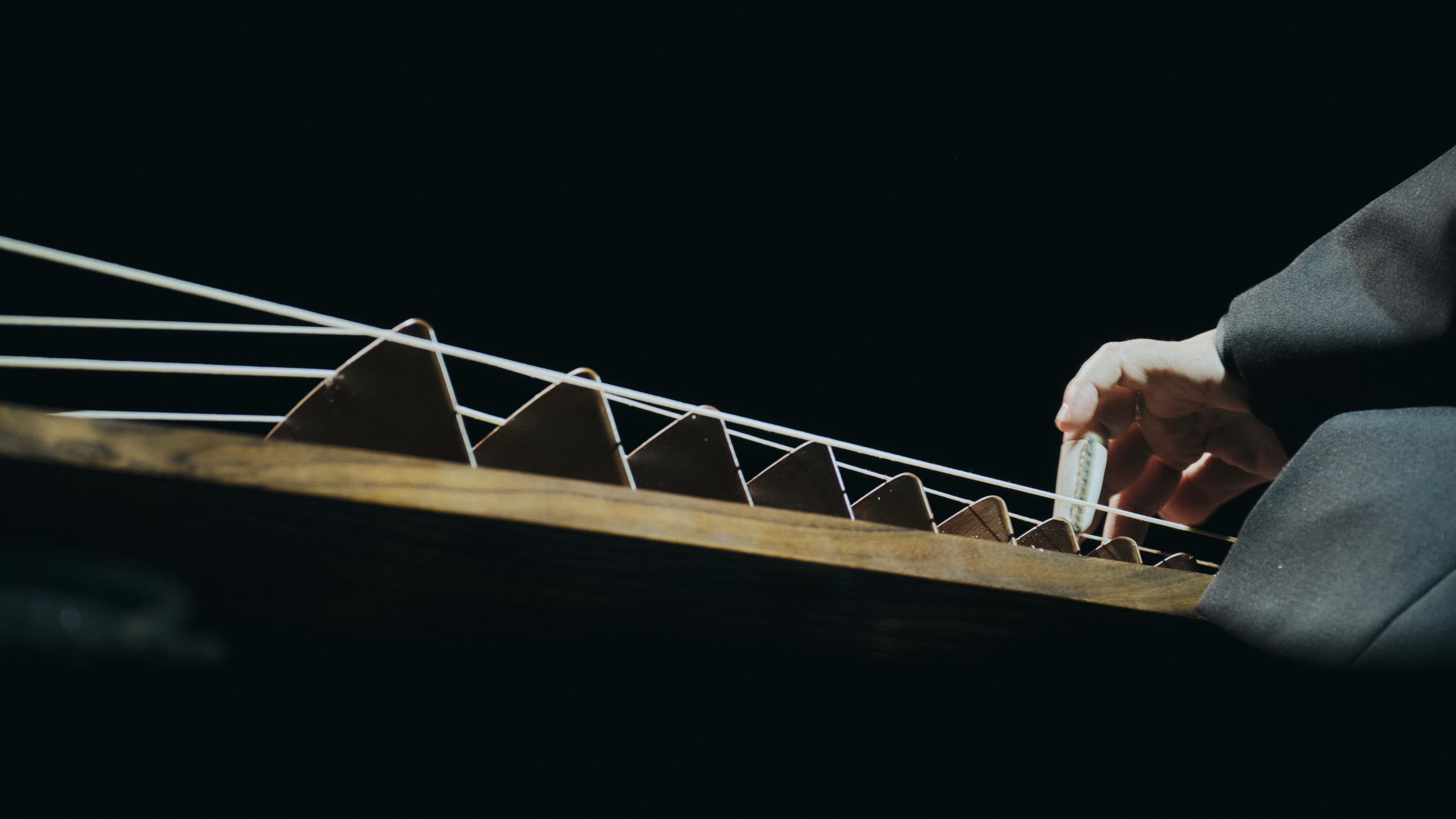 거문고와 같은 대형 지터류 악기 연행에서는 보통, 하나의 마이크를 측면이나 하단에 두어 수음한 뒤 이를 이퀄라이저 등을 통해 (대체로) 깎아내어 새 공간에 맞추어내는 믹싱의 방식이 사용된다. 시각예술로 비유하자면 풍경을 판화로 옮긴 후 음각(陰刻)하는 과정에 가까운 매만짐의 형태다. 반면, 이 공연에서 사운드 디렉터 이경환, 사운드 디자이너 김영일과의 협업을 통해 연주자가 보여준 방식은 복수(여섯 개)의 마이크를 붙여 수음한 다중의 소리 재료를 얻어내고, 이를 섞어 사전에 의도된 (연주자 곁에서 듣는 소리의) 값으로 만드는 종류의 라이브 믹싱이었다. (사실 악기 라이브 믹싱에서 ‘블렌딩(blending)’ 자체는 흔하나, 단일한 현악기 연주에서 마이크-마이크, 마이크-피에조 픽업과 같이 둘 정도까지를 섞는 것이 자연스러움과 효율성을 위해 대부분 사용되는 방식이다) 다시 비유하자면 필요에 따라 소스를 서로 붙여내는 소조(塑造), 더 나아가자면 기존 측정·계산값을 입력해 이를 구현하려는 지향이라는 의미에서 (사전 프로그래밍에 의한) 3D 프린터 작업의 라이브 버전에 가깝다고 하겠다.
